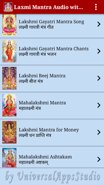 이 무료 앱은 힌두교 신 라크시미의 가장 잘 알려진 명상을 듣는 데 도움이되는 훌륭한 도구입니다. 간단하고 깨끗한 인터페이스를 가지고 있으며 매우 쉽게 사용할 수 있습니다. 다음 카테고리에서 노래를 들을 수 있습니다: